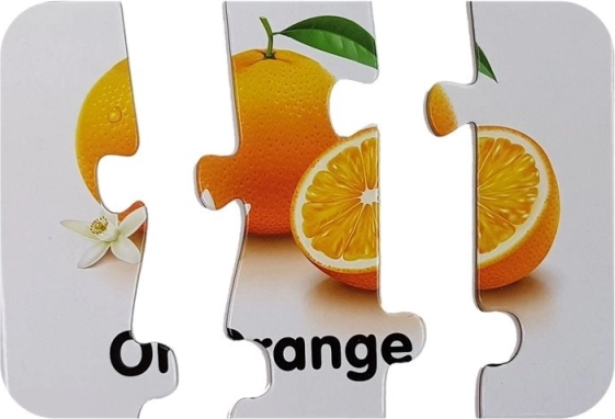 Jedes Teil zeigt ein Obst und seinen Namen auf Englisch (z. B. Apple, Banana, Orange). Kinder prägen sich die Wörter durch die Verbindung von Bild und Text ein.