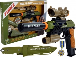 Militär-Set für kleine Action-Fans: enthält eine Pistole mit Licht- und Soundeffekten, ein Gummimesser mit Scheide und eine Medaille. Hergestellt aus hochwertigem Kunststoff, in Armeegrün, ideal für kreatives Spiel und als Ergänzung zum Kostüm. Die Pistole bietet Schussgeräusche, Lichteffekte, Schalldämpfer, Visier und Taschenlampe. Geeignet ab 3 Jahren, Batterien sind enthalten.