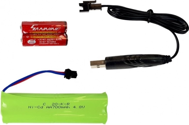 Inklusive 4,8‑V‑700‑mAh‑Akku und USB‑Kabel für bequemes Laden. Bis zu 15 Minuten Fahrzeit nach ca. 200 Minuten Laden.