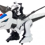 Der Roboter besteht aus robustem Kunststoff in einer weiß-schwarzen Farbkombination mit roten und blauen Details. Sein Design umfasst bewegliche Teile wie Flügel und Beine, wodurch der Dinosaurier lebendige Bewegungen ausführen kann. Ergänzt wird alles durch eine Reiterfigur, die den Dinosaurier „steuert“.