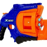 Die Pistole hat ein Drehmagazin für 6 Geschosse. Um ein Geschoss abzufeuern, ziehen Sie einfach den Auslöser nach unten und drücken Sie den Abzug! Eine große Menge an Geschossen ermöglicht endlosen Spaß. Das Set enthält auch Dosen als Ziele!