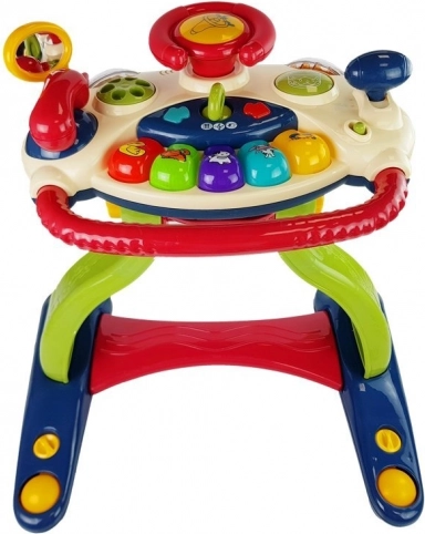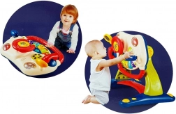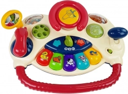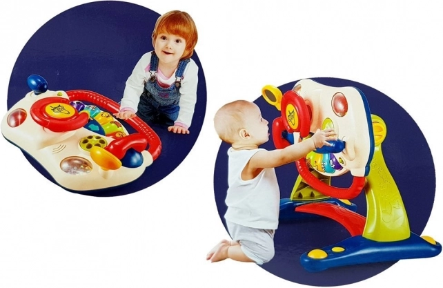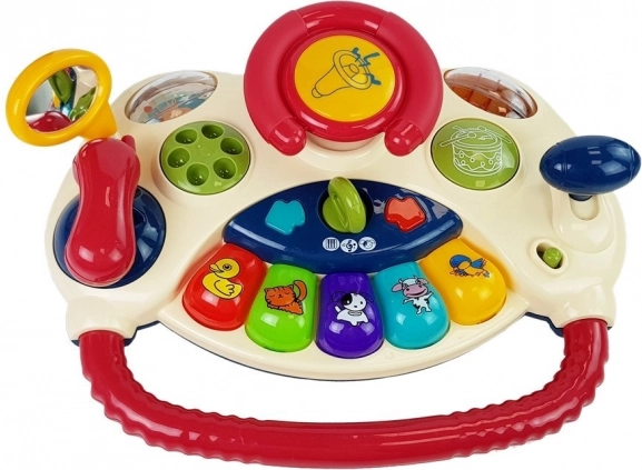 Buntes Lenkrad mit Schalthebel und Spiegel, das motorische Fähigkeiten entwickelt und eine kreative Umgebung für Kinder bietet.