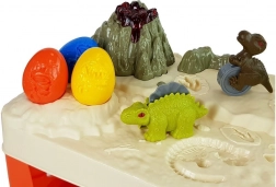 Der Tisch bietet einen Vulkan mit leuchtender Lava für ein weiteres Spielelement. Enthalten sind drei Eier, die einen kleinen Dinosaurier verbergen, und drei größere prähistorische Tiere für präzises Ausstechen und Prägen von Motiven. Dies fördert die feinmotorischen Fähigkeiten und visuelle Koordination der Kinder.