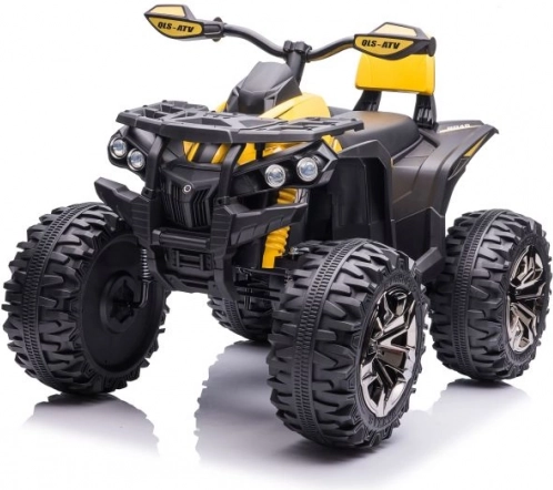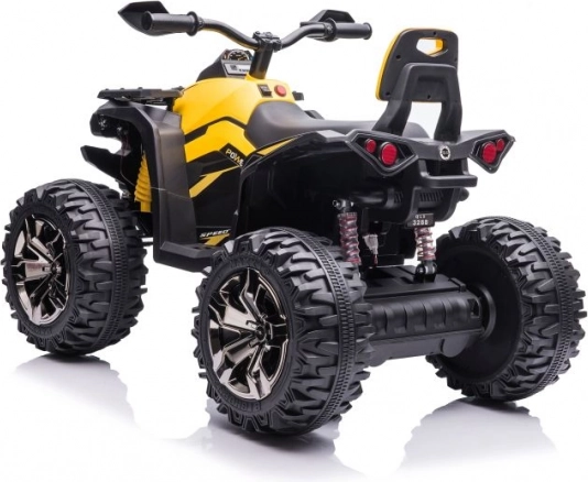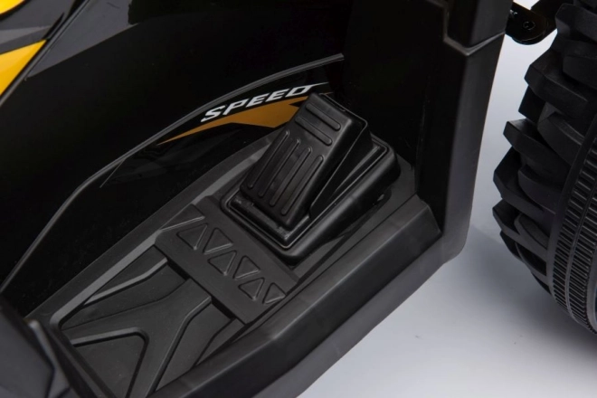 Gelb‑schwarze Ausführung, Lenker mit Spiegeln und Fahrwerksdetails verleihen dem Quad das Aussehen eines echten ATVs.
