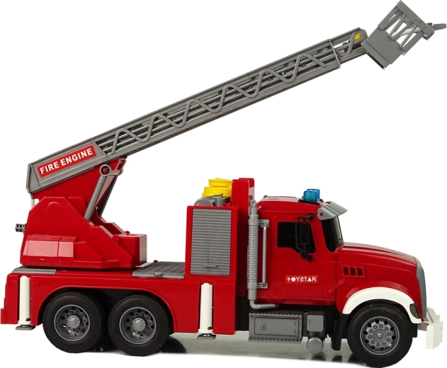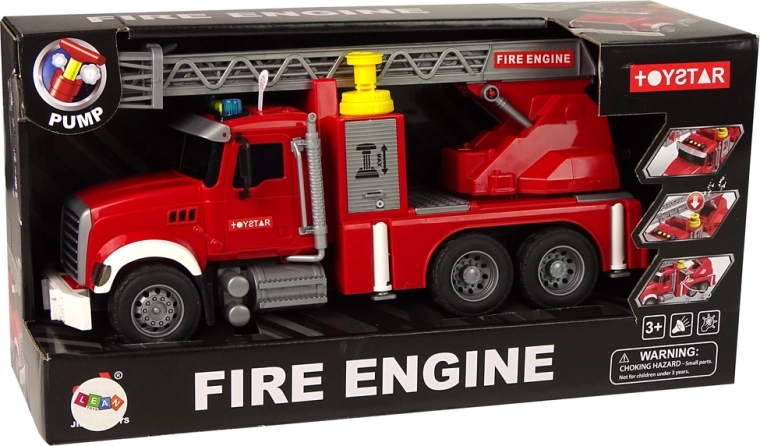 Im oberen Teil der Kabine hat das Fahrzeug eine gelbe Öffnung, durch die man leicht Wasser einfüllen kann. Wenn Sie mehrmals drücken, sehen Sie, wie Wasser aus dem an der vorgesehenen Stelle montierten Schlauch fließt. Ihr kleiner Helfer ist einsatzbereit! Drücken Sie die Taste oben am Behälter und beobachten Sie, wie das Wasser zu fließen beginnt! Er kann kleine Brände löschen. Die Leiter wird mit einer Kurbel angehoben.