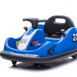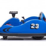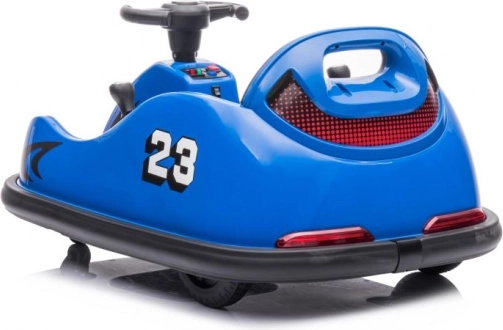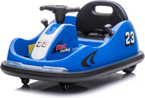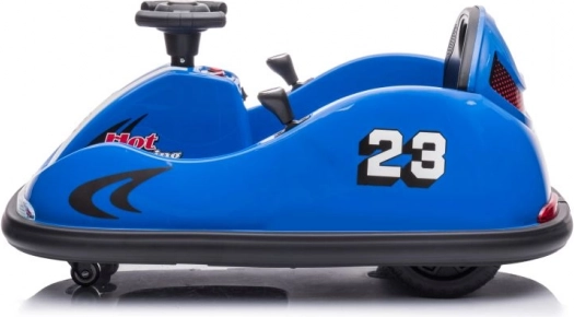 Das blaue Kinder-Bumpercar mit der Startnummer 23 und dem Hot-Racing-Design bietet actionreichen Fahrspaß auch auf kleinem Raum. Dank der kompakten Abmessungen und schwenkbaren Rollen beherrscht es präzise Manöver und sanftes Drehen auf der Stelle. Der Sitz mit Rückenlehne und der umlaufende Schutzrand erhöhen Sicherheit und Komfort während der Fahrt.