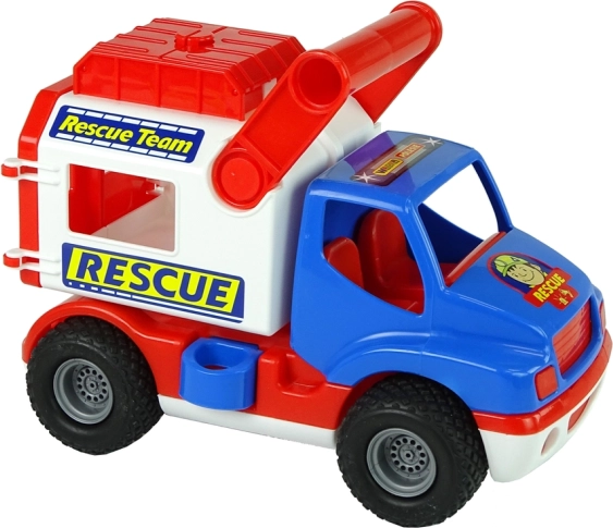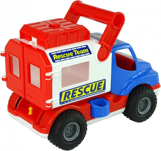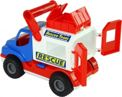 Das Fahrzeug ist mit Gummirädern mit rutschhemmendem Profil für eine ruhige Fahrt ausgestattet, hat öffnende rote Hecktüren sowie ein oberes Fach für Kleinigkeiten. Eine seitliche Sicherung hält den Aufbau stabil – nach dem Lösen wird der Aufbau beweglich und kann mit einem Hebel nach hinten gekippt werden. Aufkleber mit dem Motiv „Rescue/Rescue Team“ unterstützen das Rollenspiel.