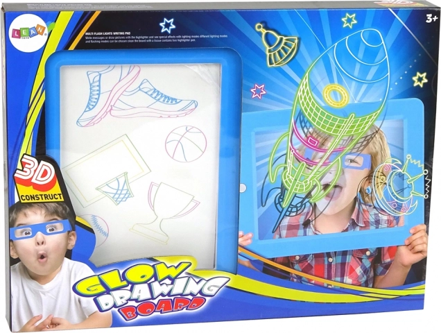 Die magische beleuchtete Tafel ist ideal für die ersten Schritte beim Zeichnen und Schreiben. Das transparente Panel mit LED-Effekten lässt jeden Strich erstrahlen und zaubert auf Knopfdruck verschiedene Lichtmodi. Einfach eine Schablone einlegen, die Konturen mit fluoreszierenden Markern nachzeichnen und die 3D-Brille aufsetzen – schon verwandeln sich die Bilder in eine eindrucksvolle 3D-Show.