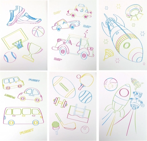 Im Set enthalten: 4 Neonmarker, Reinigungstuch und zweiseitige Schablonen zum einfachen Nachzeichnen für einen schnellen Start.