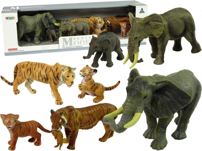 In der Verpackung finden Sie Erwachsene und Jungtiere – Elefanten und Tiger – ideal zum Erschaffen von Geschichten, Szenen und Lernaktivitäten. Das Set ist in einer Geschenkbox verpackt und eignet sich daher hervorragend als originelles Geschenk für kleine Tierliebhaber.
