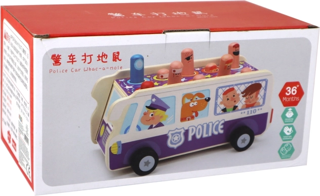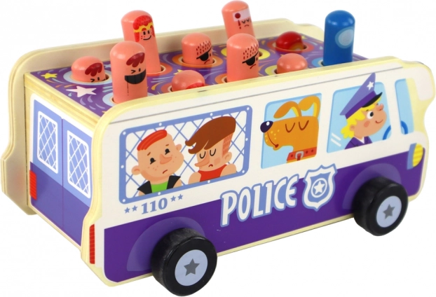 Der Polizeibus aus massivem Holz verbindet die klassische Klopfbank mit Fahrspaß auf Rädern. Kinder schlagen mit den Hämmern auf die sich heraushebenden Stifte/Figürchen und trainieren Genauigkeit, Konzentration und Reaktionsvermögen. Die robuste Verarbeitung und die verspielten Illustrationen laden zum wiederholten Spielen ein und fördern die Fantasie.