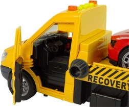 Schlüpfe in die Rolle eines kleinen Straßenhelfers. Der Abschleppwagen hat zu öffnende Türen, eine mit einem Drehrad bedienbare Heberampe und einen ausziehbaren Aufliegerteil mit Haken zum einfachen Ankuppeln und Aufziehen des Autos. Integrierte Licht- und Soundeffekte (Hupe, Bergung mit Alarm, Rückwärtsfahren) machen das Spiel besonders authentisch.