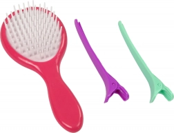 Entdecken Sie das Set, das eine Bürste, ein Glätteisen, zwei Spangen und sechs bunte Haarkreiden enthält.