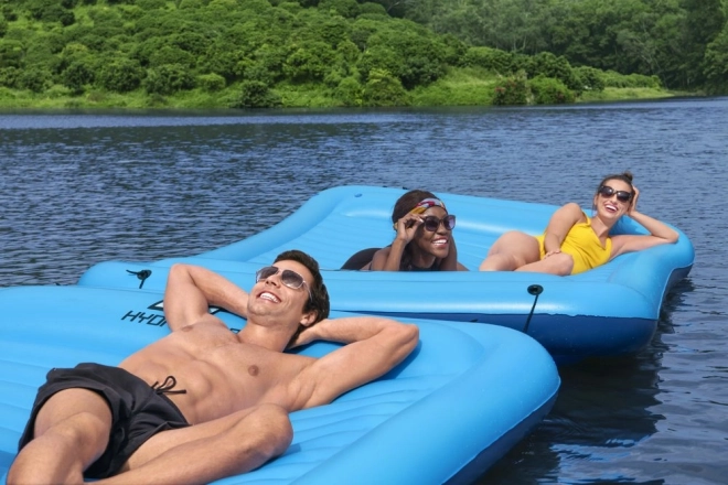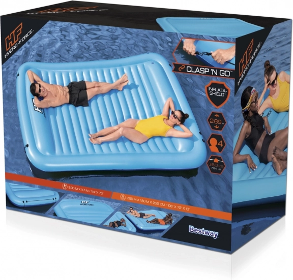Die große aufblasbare Schwimminsel Hydro-Force Sun Soaker von Bestway ist für alle konzipiert, die ihren Urlaub gerne in größerer Runde verbringen. Dank ihrer beeindruckenden Abmessungen bietet sie bequem Platz für bis zu vier Erwachsene, und dank des umlaufend integrierten Kissens kann sich jeder entspannt in der Sonne sonnen. Integrierte Clasp 'N Go-Verschlüsse ermöglichen das Verbinden mehrerer Schwimminslen miteinander und sorgen so für noch mehr Spaß mit Freunden in einer größeren Gruppe! Das Inflata-Shield-Material gewährleistet Durchstichfestigkeit und reduziert die Dehnung.