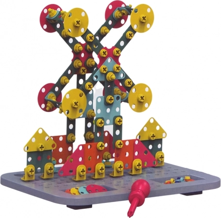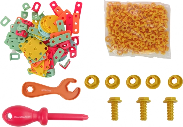 Lieferumfang: Werkzeugkoffer zum Zusammenbauen, batteriebetriebener Akkuschrauber, Konstruktionsplatte, Gabelschlüssel, Schraubendreher, großes Set Muttern und Schrauben, flache Teile in Formen geometrischer Figuren.
