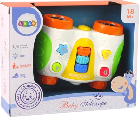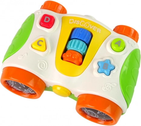 Fröhliche Geräusche, Melodien und Lichteffekte motivieren zum weiteren Entdecken. Das Spielzeug unterstützt das Erkennen von Farben und Formen und bietet auch das Erlernen von Buchstaben. Die effektvolle Gestaltung und die lebendigen Farben machen das Fernglas zu einem attraktiven Zusatz für die Spielecke jedes kleinen Forschers.