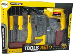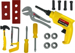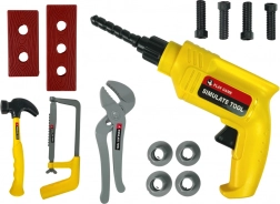 Enthalten sind eine simulierte Bohrmaschine, ein Hammer, eine Säge und eine Zange – alles in einer Ausführung, die echtem Werkzeug ähnelt und zum Nachahmen der Erwachsenen anregt.