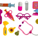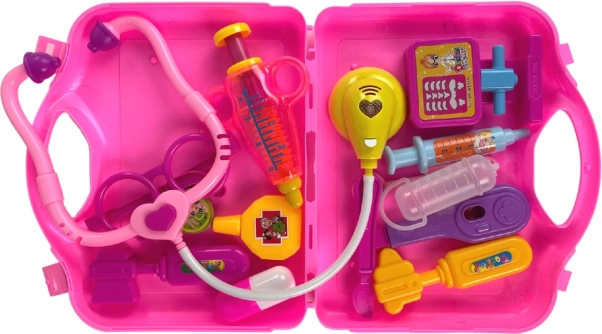 Das Stethoskop mit Herzchen lässt beim Auflegen ein rotes Lämpchen aufleuchten, das eine „Untersuchung“ signalisiert. Anschließend können die kleinen Ärztinnen und Ärzte eine „Spritze“ geben, „Medikamente“ verschreiben und sich um die schnelle Genesung des heimischen Patienten kümmern. Alle Teile bestehen aus hochwertigem Kunststoff, haben keine scharfen Kanten und lassen sich leicht wieder im Koffer verstauen.
