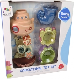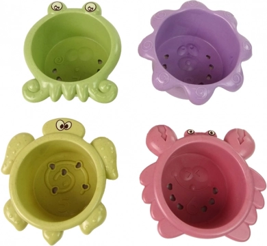 Das Set umfasst Plastikbecher in Form von Meereslebewesen mit Öffnungen, die es ermöglichen, verschiedene Wasserströme zu beobachten.