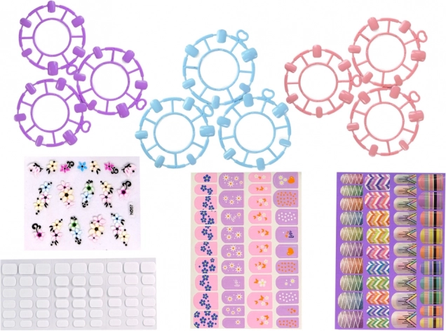 Mehrfarbiges Set aus Nagellacken und verschiedenen bunten Aufklebern. Klassische Aufkleber mit Mustern ermöglichen eine schöne Maniküre, die sich schnell und schonend mit herkömmlichem Nagellackentferner lösen lässt. Glitzer verleiht den Nägeln Funkeln und Effekt. Die Lampe härtet den Lack aus und der Fräser kümmert sich um die Nagelhaut.