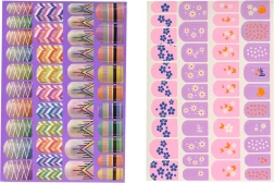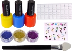 Verschönern Sie Ihre Nägel mit verschiedenen gemusterten Aufklebern und losem Glitzer in drei leuchtenden Farben.
