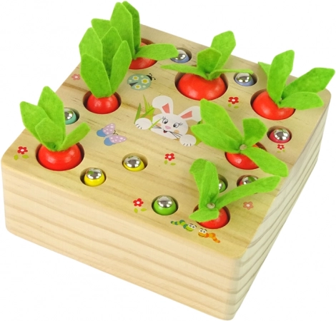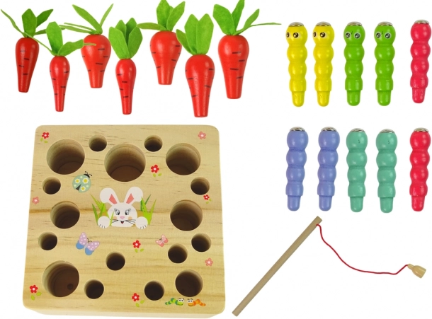 Im Set enthalten sind eine Holzbasis mit Öffnungen, 6 Karotten, 6 Würmchen und eine magnetische Angel. Jede Karotte hat eine andere Größe und gehört in die entsprechende Öffnung, was Sortieren und Feinmotorik fördert. Der Magnet am Ende der Angel ermöglicht das einfache „Herausfischen“ der Würmchen – zufällig oder nach Farbe, was Elemente von Zusammenspiel, Konzentration und spielerischem Gartenabenteuer hinzufügt.