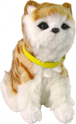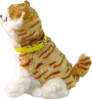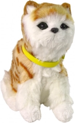 Diese realistische Plüschkatze in weiß-rot getigertem Fell mit braunen Streifen und gelbem, abnehmbarem Halsband verzaubert jedes Kind. Nach dem Streicheln am Kopf erwacht sie zum Leben – sie miaut sanft und bewegt niedlich Kopf und Schwanz. Das weiche, zarte Fell macht sie zum Lieblingskuscheltier fürs Bett und für unterwegs.