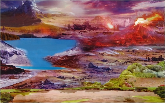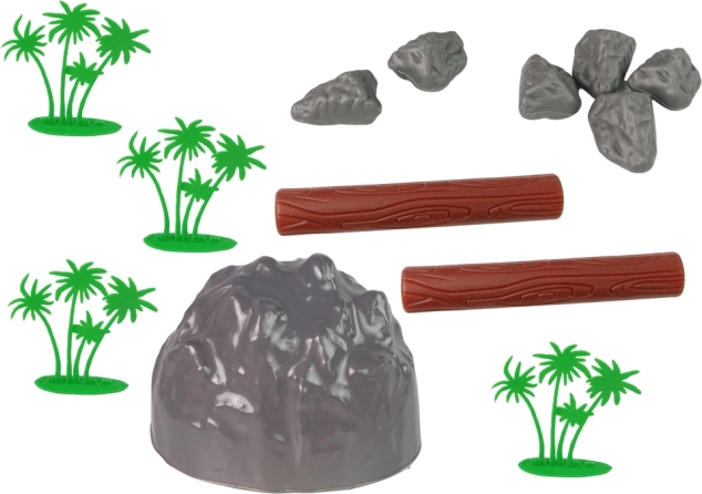 • 2 Stück Holz, 4 Palmen, ein großer Felsen, 6 kleine Felsen