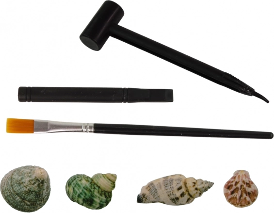 Im Lieferumfang enthalten sind sichere Werkzeuge für kleine Archäologen: Meißel, Hammer und Pinsel. Kinder trainieren Genauigkeit, Geduld und manuelle Geschicklichkeit und können sich nach und nach ihre eigene Muschelsammlung aufbauen. Auf der Verpackung sind mögliche Modelle abgebildet (z. B. Jakobsmuschel, grüne Schnecke, Turridae, Schnecke mit schwarzem Mund, Schnecke mit roter Färbung), sodass das Erkennen leicht fällt.