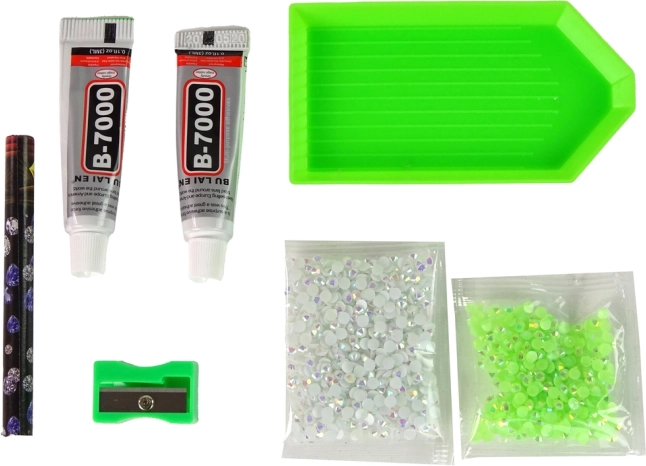 Enthält alle notwendigen Elemente, einschließlich zwei Kristallpakete, Kleber, eine Kristallschale und einen Wachsstift.