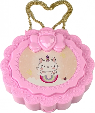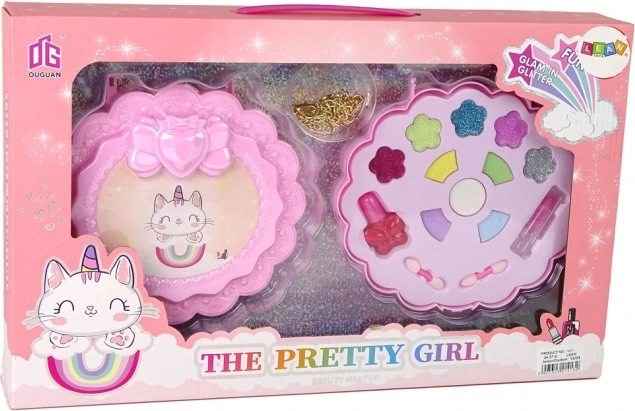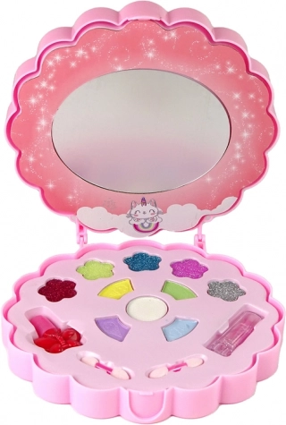 Dieses rosa Schönheitsset mit Einhorn ist ideal für Kinder, die gern mit Farben und Looks experimentieren. Es enthält Kinder-Lidschatten, Glitzer, rosa Lippenstift, Nagellack, Schaumapplikatoren und eine goldene Halskette – alles ausgelegt für sichere Anwendung auf empfindlicher Kinderhaut.