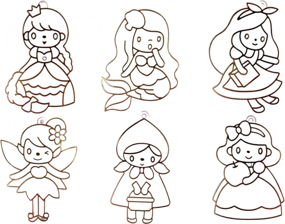 Sechs transparente Prinzessinnenmotive zum Ausmalen verwandeln jeden Nachmittag in eine kreative Werkstatt und schmücken Fenster oder Rucksäcke mit originellen Anhängern.