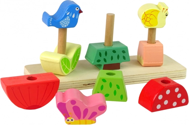 Dieses Holzpuzzle besteht aus einer stabilen Basis mit drei Stiften, auf die Kinder die Holzteile in beliebiger Reihenfolge stecken, sodass sie zueinander passen. Die Teile zeigen Pflanzen, Schmetterlinge und Vögel – die Aufgabe besteht darin, sie ihrer natürlichen Umgebung richtig zuzuordnen, zum Beispiel den Schmetterling zur Blume oder den Vogel zum Baum. Das Puzzle fördert so die Vorstellungskraft und das Wissen über die Natur.