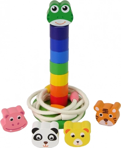 Dieses hölzerne Lernspielzeug vereint zwei beliebte Aktivitäten in einem: das Stapeln eines farbigen Turms mit dem Kopf eines niedlichen Frosches oder eines anderen Tieres und das Werfen von Seilringen auf einen Stab. Teile in satten Farben motivieren Kinder auf natürliche Weise zum Sortieren, Zählen und Entdecken, während die robuste Holzkonstruktion eine lange Lebensdauer gewährleistet.