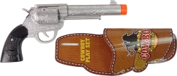 Leichter Revolver (23 × 10 × 4 cm) liegt gut in der Hand und ist dank Gürtelholster stets griffbereit. Die sichere orangefarbene Spitze zeigt klar, dass es sich um ein Spielzeug handelt.