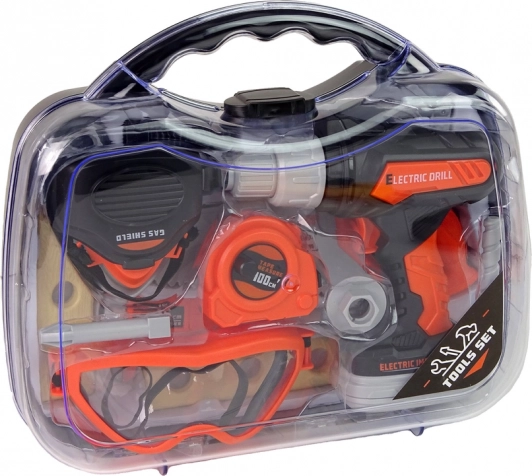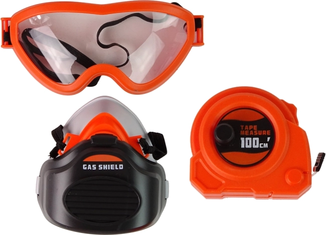 Das gesamte Werkzeugset ist in einem praktischen Koffer verstaut. Es enthält Plastikwerkzeuge, darunter einen batteriebetriebenen Bohrer, der sich beim Drücken eines Knopfes dreht und realistische Geräusche macht. Für die Sicherheit beim Spielen sind Schutzbrille und Maske Teil des Sets. Außerdem gibt es ein kleines Maßband und eine Säge für präzises Arbeiten. Alle Teile sind so gestaltet, dass sie Kindern helfen, manuelle Fähigkeiten zu erlernen und zu üben.