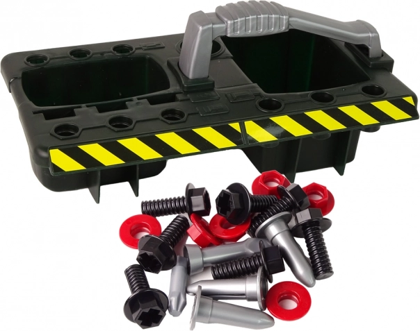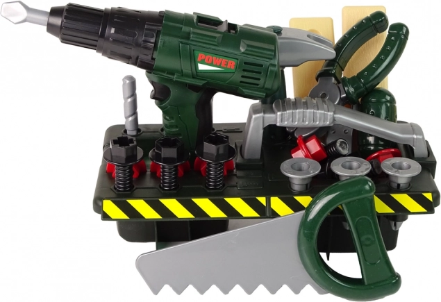 Zum Set gehören Schrauben, Sägen, Schlüssel und weitere Spielzeuge, die vielfältige Spielmöglichkeiten bieten.