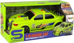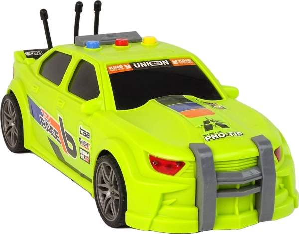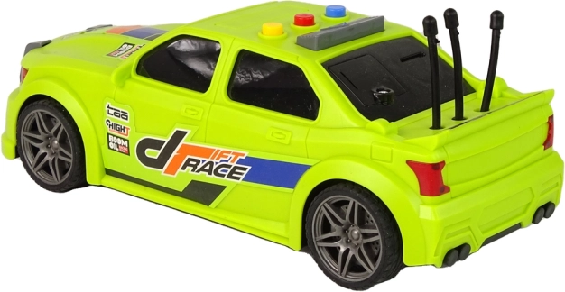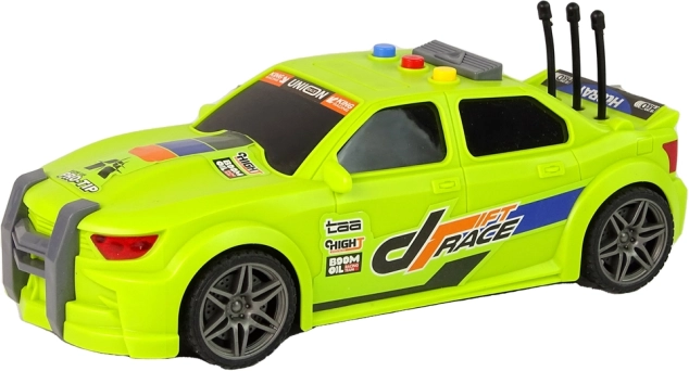 Die neongrüne Karosserie mit auffälligen „Drift Race“-Decals, Sportfelgen und niedrigem Profil verleiht dem Auto einen authentischen Rennlook, der Kinder sofort begeistert.