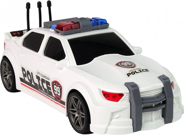 Der weiße Sportwagen mit der Aufschrift City Guardian Police und auffälligen Aufklebern wirkt authentisch und unterstützt kreative Polizeieinsätze.
