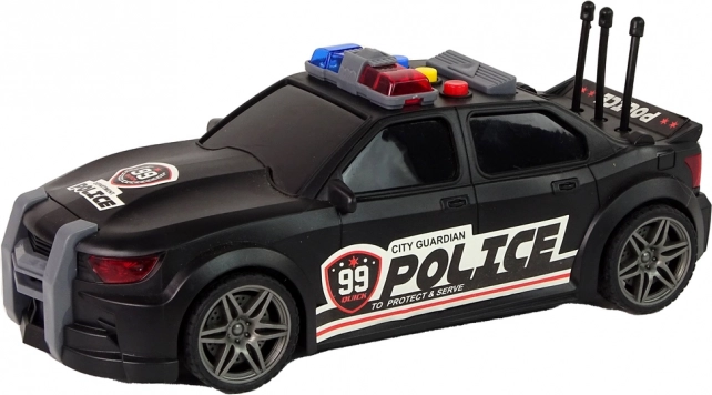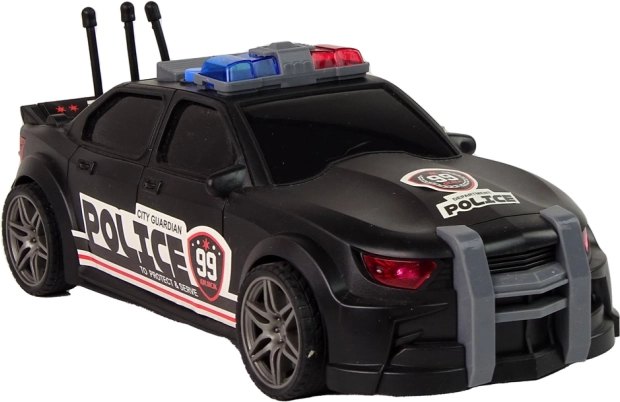 Schwarze Sportoptik mit POLICE-Aufschriften, blau-roten Blaulichtern und Antennen verleiht dem Spielzeug ein realistisches Erscheinungsbild.