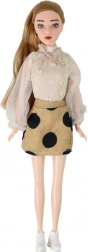 Emily hat lange, leicht kämmbare Haare, ein modernes Outfit mit gepunktetem Rock und eine Brille, die ihren individuellen Stil unterstreicht.