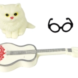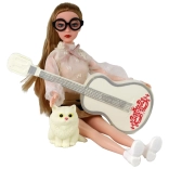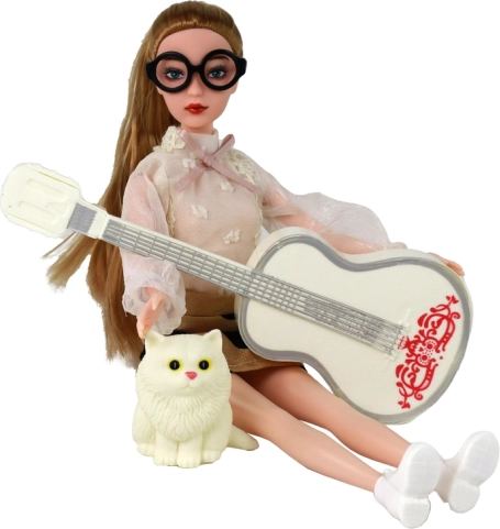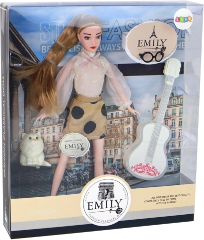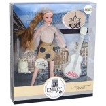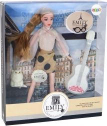 Puppe Emily bezaubert mit einem eleganten Look: eine transparente weiße Bluse mit Details, ein brauner Rock mit schwarzen Punkten und weiße Sneaker. Die zu einem Pferdeschwanz gebundenen langen blonden Haare werden durch eine schwarze Brille ergänzt. Die weiße Gitarre mit rosa Verzierungen lädt zu kreativem Spiel und zum Erzählen eigener Geschichten mit dem treuen Kätzchen an ihrer Seite ein.