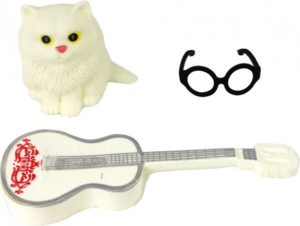 Zum Set gehören ein weißes Kätzchen und eine stylische Brille. Das Zubehör fördert die Fürsorge für das Tier und erweitert die Spielszenarien.