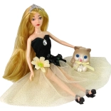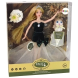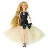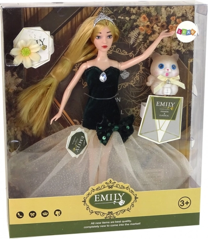 Puppe Emily begeistert mit ihrem edlen Erscheinungsbild: ein dunkelgrünes Oberteil, ein reich ausgestellter Tüllrock mit Glanz und Paillettendetails verleihen dem Outfit besonderen Charme. Schwarze Schühchen mit Rosendekor komplettieren das Ensemble – ideal sowohl zum Spielen als auch für die Kindersammlung.