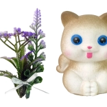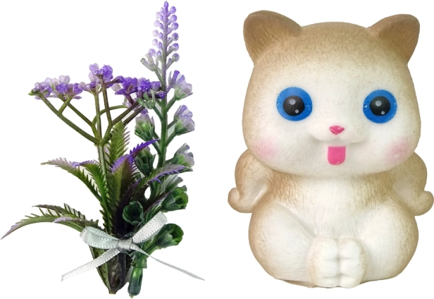 Zum Set gehören ein kleines Kätzchen und ein Strauß violetter Blumen – ideal zum Erfinden von Geschichten und zum Dekorieren der Spielwelt.