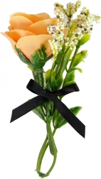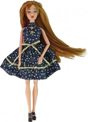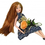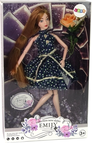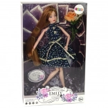 Emily hat langes, schön frisiertes Haar, ein elegantes Blumenkleid und schwarze High-Heels. Im Set finden Sie außerdem eine Zierrose, die das Outfit für die Modenschau abrundet.
