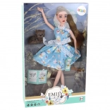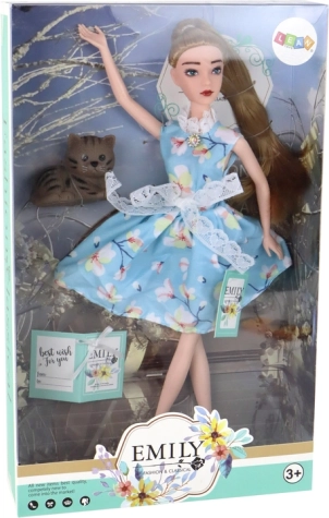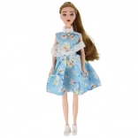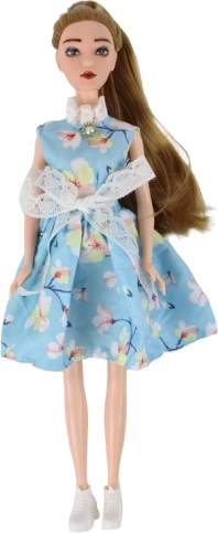 Puppe Emily (30 × 7 × 4 cm) ist eine zarte Begleiterin für kreatives Spiel. Sie hat lange, dunkelblonde Haare, die sich leicht kämmen und stylen lassen, grüne Augen und ein dezentes Make-up für einen realistischen Look. Sie trägt ein bezauberndes blaues Kleid mit Blumenmuster, Spitze, Schleife und Kragen, ergänzt durch ein kleines „diamant“-Detail am Hals und weiße Schuhe.