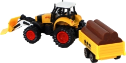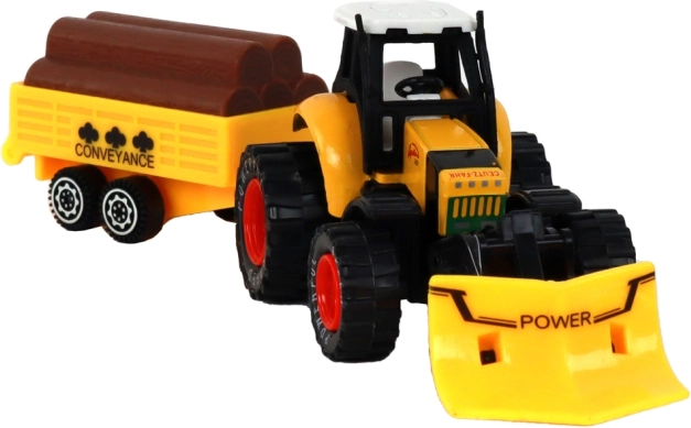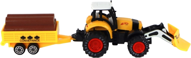 Der Traktor ist mit Friktionsantrieb ausgestattet, der eine einfache Steuerung der Bewegung des Traktors ermöglicht. Kinder können Bauernhof spielen und verschiedene Materialien auf dem Anhänger transportieren, der mit Baumstammimitationen ausgestattet ist.