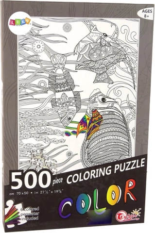 Malpuzzle bieten unzählige kreative Möglichkeiten. Das Set enthält 500 schwarz-weiße Puzzleteile und 6 Filzstifte, mit denen das Bild nach eigenem Geschmack ausgemalt werden kann. Das Puzzle zeigt Fische im Ozean, umgeben von Pflanzen.
