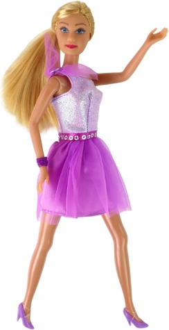 Kleiden Sie Ihre Puppe Lucy in ihr elegantes lila Kleid mit glitzerndem Oberteil und ausgestelltem Rock. Zum Kleid gehört auch ein lila Gürtel, verziert mit Pailletten, der ihre Silhouette betont.